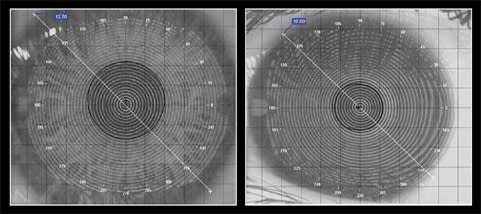 Figure 1. A photokeratoscopy view of a large 12.70mm cornea (left) and a small 10.60mm cornea (right). The 12.7mm cornea would be best fit with a custom soft contact lens with an overall diameter of at least 14.7mm whereas the 10.6mm cornea would require a custom soft lens with an overall diameter of approximately 12.6mm.