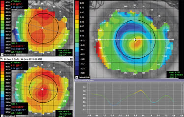 Figure 10. Bulls-eye topography after 16 nights of wear displaying a large, uniform treatment zone and –2.80D prescription change.