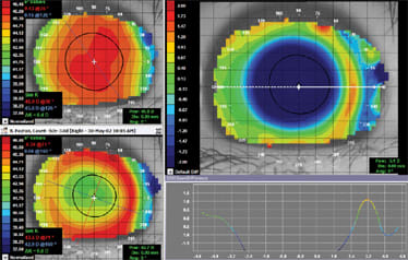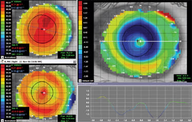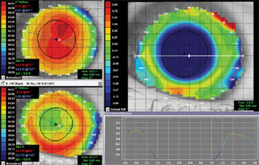 Figure 7 shows the one-night post-treatment topography of our patient, with an acuity of 20/50. As you can see, the central cornea did not respond as significantly as did the peripheral cornea. Only a percentage of effect was achieved after one night of wear. Considering this as well as that the visual acuity was significantly improved and the treatment zone (blue area of flattening) looks well-centered, we continued the trial wear for additional nights to prove out the effect.