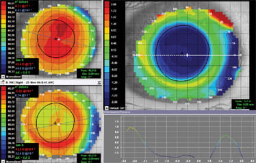 Following our usual pre-contact lens fitting assessments (patient history, eye health exam, prescription), our coordinator takes four independent corneal topography readings of each eye. The accuracy of our corneal data determines the success with the initial diagnostic lens, so our technician takes the time to achieve four quality captures OU (Figure 1). Any maps demonstrating tear film breakup, inconsistencies, small fissures or unusual appearing plots are deleted and retaken. Our office uses the Medmont E300 Corneal topographer (Medmont/Precision Technology Services, Ltd.) because we find that it is accurate and because it features software designed for orthokeratology and specialty contact lens fitting.