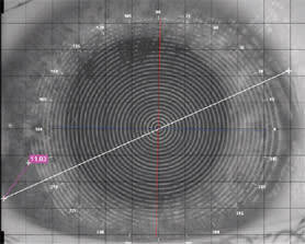 Only three pieces of corneal data are required from our topographer: the apical curvature or radius at the apex of the cornea (also known as Ro or Radius at zero), the sagittal height of the cornea and the horizontal visible iris diameter (HVID). From the topography captures, the software determined the mean values for the apical radius (7.511mm) and sagittal height (1559.1 microns). Figure 2 shows our measure of the HVID.