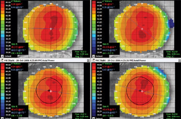 1. Axial Subtractive Map Determines the treatment zone position (blue central area of flattening) in relation to the pupil margin (black ring). The prescription change or effect of treatment can be observed by measuring the apical power difference. The technician can determine the change in refraction by clicking the cursor on the center of the map (visual axis).