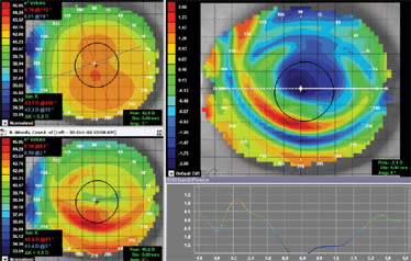 At this point, very little has been invested by either our practice or our patients. Only when both patient and practice are certain of the result do we incur the cost of the custom lens. Figure 8 displays the post-treatment subtractive map after five consecutive nights of wear. Note a more significant apical effect and a treatment zone that has filled in nicely. The patient's VA improved from 20/50 after one night to 20/20 after five nights.