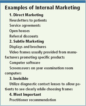 For most of us in eyecare practice, external marketing is advertising or communicating with people you do not know (potential patients) while internal marketing is advertising or communicating with people you do know (your current patients). Examples of external marketing are the Yellow Pages, practice Web page, billboards, direct mail, TV, or radio.