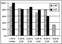 Patients with lower refractive errors are more successful compared to higher myopes. Although FDA approved for temporary myopia reduction up to −5.00D to −6.00D, data from the FDA clinical study for Vision Shaping Treatment (VST, Bausch & Lomb) and Paragon CRT (Paragon Vision Sciences) lenses show a decrease in the percentage of patients achieving full correction as initial myopia increases above −4.00D (Figure 1).