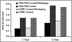 Figure 2. Mean axial growth data from years one and two of the CRAYON (Walline et al, 2009) and LORIC (Cho et al, 2005) studies comparing corneal reshaping treatment to controls.