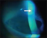 When I viewed the lenses with the slit lamp, both had protein buildup, visible as a white haze on the surfaces. On the right lens, a dried plug of mucus had formed in the drill-mark (Figure 1). The plug protruded from the lens and had a jagged surface. With lid eversion I noted a localized area of papillary conjunctivitis on the tarsal plate that exhibited mild injection. Although the protein deposits were likely making the lenses less comfortable and decreasing acuity, this mucous plug was the true culprit.