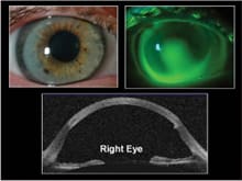 Corneal topography showed a significant corneal ectasia OD, with dioptric powers ranging from 42.50D to 56.50D (Figure 1). There was significant inferior thinning and steepening at the inferior graft-host interface resulting in a highly asymmetrical cornea (Figure 2). The left eye demonstrated a more normal anterior segment shape, but exhibited 7.50D of with-the-rule astigmatism (Figure 3). Both corneas exhibited significantly steeper than normal midperipheral corneal and scleral slopes.