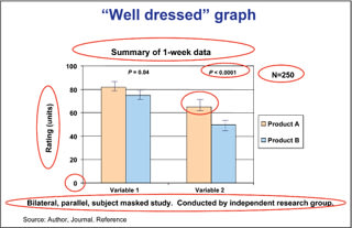 Examine the scales on graphs carefully. Specifically, watch out for a truncated y axis that suppresses the zero. This is a common visual trick to emphasize an effect, as is evident in Figure 3. A 3-D graphic can also accentuate differences between results. The "well-dressed" graph should include the following features: title, footnote with further details, timeframe, sample sizes (n=), clearly labeled axes, units of measurement, meaningful scales, error bars or box-and-whisker graphs, and P values (Figure 4).