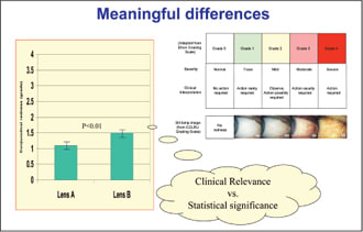 He is absolutely right on that point. In Figure 5, you can see that there are significant differences in slit lamp findings between the lenses (P=0.01). However, because conjunctival redness less than Grade 2 rarely requires clinical action, the difference is not very important in practice. Conversely, where results are not found to be statistically significant it may still be worth considering their clinical significance.