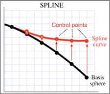 Splines Although formalized in the 1970s, spline functions remained a curiosity until computers capable of handling their vast numbers of recursive calculations became available. Unlike conics, which are defined by radius of curvature, the shapes of cubic splines are determined by the position (coordinates) of a series of control points through which they are required to pass through seamlessly (second order continuity). Thus their shapes are manipulated simply by moving the appropriate control points to positions that outline the desired contour (Figure 4). Making localized changes in the shape of a spline surface becomes a simple, intuitive exercise, and by definition they are always junctionless. Splines turned out to be the ideal platform for manipulating the shape of the haptic surfaces to match that of the underlying scleras.