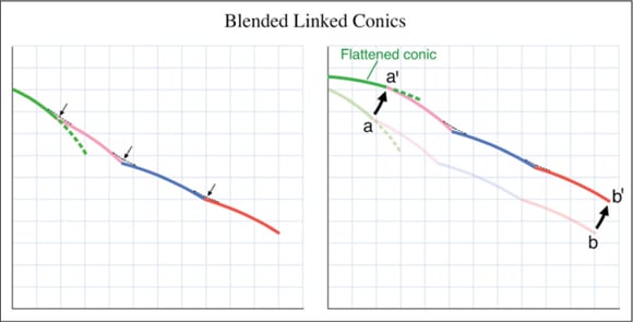Aligning the Haptic Bearing Surface With the Underlying Sclera Linking a series of conics (spheres and ellipses) and blending their junctions (Figure 3 a), although satisfactory for elevating the edges of GP corneal contact lenses, is far from ideal as a surface shaping tool. For example, increasing the radius of one of the segments to elevate that surface also raises all of the peripheral linked segments (Figure 3b). This technique works well enough for large scleral lenses, but for smaller scleral diameters we needed to find a better way of shaping the haptic surfaces to align them with those of the underlying sclera. We found it in spline functions.