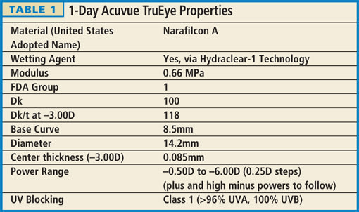 Given the wearing habits of teenagers, a preferable lens material is arguably a silicone hydrogel, but a desirable modality remains that of daily disposability. Eyecare practitioners in parts of Europe are now able to combine these two features with the recent release of the first DD silicone hydrogel contact lens, 1-Day Acuvue TruEye (Johnson & Johnson Vision Care) (Table 1). The lens is made from narafilcon A, a new material that features a new form of the proprietary Hydraclear technology specifically designed for the DD modality. The lens incorporates polyvinyl pyrrolidone (PVP) throughout the lens matrix to act as both a moisturizing and a wetting agent. With a Dk/t value of 118, this lens may be the preferred choice for many patients, particularly when compared with other currently available DD lenses.
