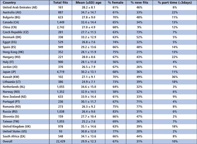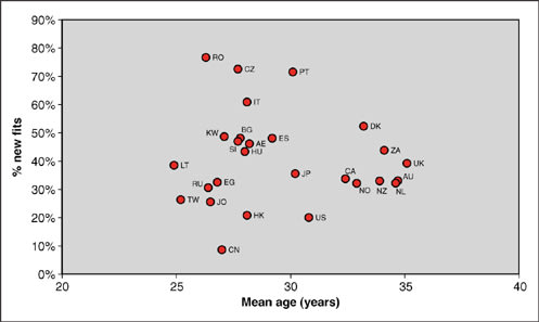 Overall, two-thirds of the contact lens patients fitted with contact lenses were female, with this value ranging from 56 percent of patients in Italy to 83 percent in Russia (Table 1). The average age at fitting was 29.9 years, with a difference of a decade between the country with the highest mean age (the United Kingdom at 35.1 years) and that with the lowest (Lithuania at 24.9 years). Typically, the more developed markets have higher mean ages at fitting (greater than 32 years for Australia, Canada, Denmark, the Netherlands, Norway, New Zealand, the United Kingdom and South Africa) compared with younger patients in the developing markets, mainly in eastern Europe and across the Middle East (less than 28 years for Bulgaria, China, Czech Republic, Egypt, Jordan, Kuwait, Lithuania, Romania, Russia, Slovenia and Taiwan).