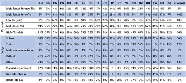 Table 3. Detailed information for prescribed rigid lenses only. See Table 1 for country abbreviations. Data presented for countries reporting >300 lens fits. EW = extended wear. Data for materials and designs pertain to daily wear new fits only.