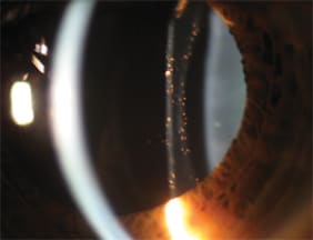 This photograph shows a Vision implantable collamer lens (ICL) from Staar Surgical. This implant was placed in the left eye of a 44-year-old female patient three years ago to correct her -15.25D of myopia. Currently, uncorrected vision of her left eye is 20/50 and manifest refraction is -1.25DS 20/25. She also underwent implantation in her right eye, resulting in 20/30 uncorrected acuity. The ICL is mildly pigmented and is vaulted away from her natural lens. The amount of vault is designated by comparing it to the patient's corneal thickness, and in this case the estimation is >90 percent vault. An ICL that doesn't vault will induce a cataract. A peripheral iridotomy is always performed pre-op to prevent angle closure after implantation. The power of the ICL is calculated using a formula available through Staar. A three-year follow up of the FDA study of ICLs showed that 94.7 percent of patients had 20/40 or better uncorrected acuity.