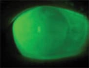 Next evaluate the limbal zone. Complete and generous limbal clearance is necessary to ensure tear circulation and prevent erosive damage to the limbal epithelial cells (Figure 5a). If you observe very little fluorescein in the limbal area of the lens (Figure 5b), then the lens is too small and you should select a larger diameter.