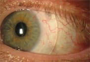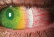 Finally, evaluate the scleral zone and lens edge. The lens should rest evenly on the scleral conjunctiva with the edge appearing just above the conjunctival epithelium (Figure 6). The lens should not move with blinking. A lens that moves will actually be uncomfortable to the patient. You can correct this by tightening the scleral zone. No fluorescein will be visible under a well-fit scleral zone except at the edge. If you observe blanching (Figure 7) or severe conjunctival compression, order a flatter scleral zone.