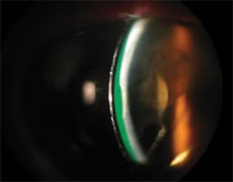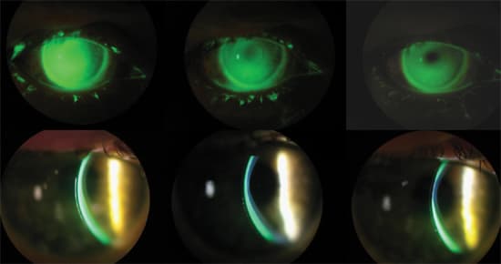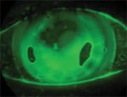 With the initial diagnostic lens held concave side up, instill saline solution into the lens and add a small amount of fluorescein. Have patients tilt their head down and centrally apply the lens so that the solution remains in the lens. A yellow wratten filter with cobalt illumination is essential to accurately evaluate fluorescein patterns because the filter greatly enhances the fluorescein. Another way to determine the amount of clearance is to use a slit beam to view the contact lens, reservoir and cornea in cross-section (as in Figure 2).