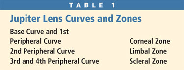 The Jupiter scleral lens has five curves organized into three zones (Table 1). Toric scleral zones are available to enhance the alignment on eyes with very irregular scleras. However, these contact lenses can have a fair amount of flexibility in the scleral zone, so toric peripheries are rarely needed. Jupiter lenses use aspheric optics to help reduce spherical aberrations and enhance visual acuity.