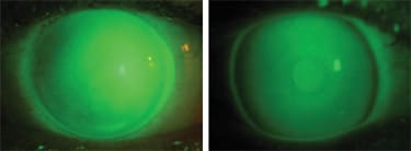 Figure 5a (left). Scleral lens with complete limbal clearance. 5b. Scleral lens with inadequate limbal clearance.