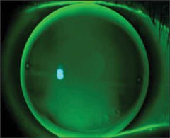 Figure 1. Bi Expert non-rotational GP lens design. Note the "dots" that designate the seg height and the steep fluorescein pattern, which facilitates rapid movement of the lens back to its proper position after blinking.