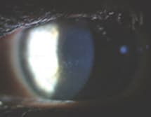 This photo shows the cornea of a 19-year-old female who initially presented with binocular ocular pain and photophobia that was more severe in the right eye. Her accompanying signs included bilateral pre-auricular adenopathy, follicular hypertrophy, multiple corneal infiltrates, and conjunctival injection. All of these presentations were more pronounced in the right eye. We diagnosed viral keratoconjunctivitis and instructed the patient to discontinue contact lens wear, initiate a treatment regimen of tapering topical steroid therapy, and return in one week for evaluation.