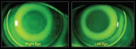 Figure 1. Lens #1 on the right eye shows an optimum fit while lens #1 on the left eye shows decentration, requiring a lens with a greater sagittal depth.
