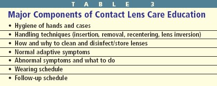 To improve patient compliance, practitioners must consistently use a combination of written, verbal and visual methods to reinforce proper contact lens use and care (Table 3). Some materials are approved for extended wear (up to 7 consecutive days and nights), and others are approved for continuous wear (up to 30 consecutive days and nights). The truth is some eyes can tolerate only daily wear regardless of the lens material.