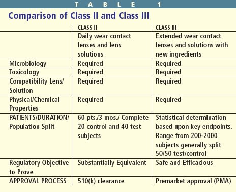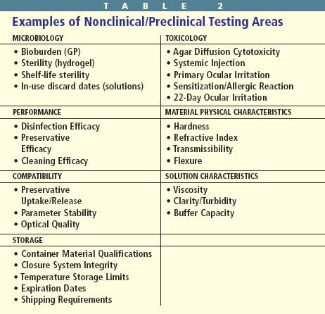 Class II special controls are used to determine the substantial equivalency of investigational contact lenses or solutions compared with similar, previously approved products. Nonclinical and preclinical testing is performed on lenses and solutions. And if the results are satisfactory, clinical trials may begin (Table 1).