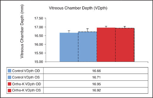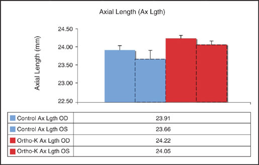 Several recent studies focused exclusively on young people have concluded that ortho-k has great promise as an effective method of myopia control. Also, the effects of ortho-k occur at a faster rate with young people than with adults. More important has been the effect on myopia progression as evidenced by changes in AL and vitreous chamber depth (VCD). Cho et al (2005) found an approximate twofold increase for spectacle wearers versus for ortho-k wearers in both AL (0.29mm for ortho-k versus 0.54mm for the spectacle-wearing control group) and VCD (0.23mm for the ortho-k group versus 0.48mm for the control group) over a two-year period for young people between the ages of 7 years and 12 years. Walline (2007) confirmed these results with the first-year results of the Corneal Reshaping and Yearly Observation of Nearsightedness (CRAYON) study in which daily wear of both conventional GP lenses and soft lenses resulted in an AL increase of 0.35mm whereas ortho-k wear resulted in AL growth of only 0.15mm.