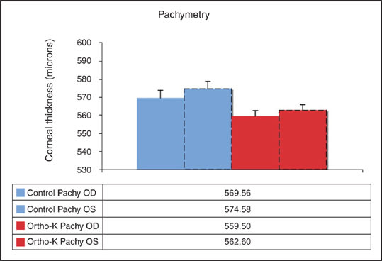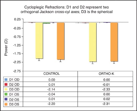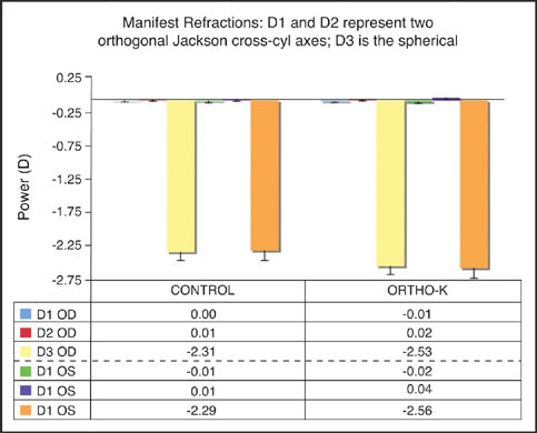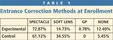 The treatment group has a mean age of 11.1 years (ranging from 7-to-14 years); the control group has a mean age of 11.7 years (ranging from 7-to-15 years). Table 1 shows the entrance correction methods of the experimental and control groups at enrollment into the study. Figure 1 shows baseline manifest and cycloplegic refraction of the test and control groups, while Figure 2 shows corneal curvature, Figure 3 shows AL and VCD, and Figure 4 shows pachymetry.