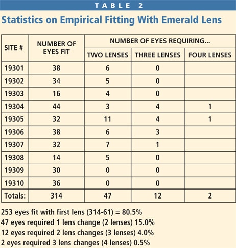 Of the 10 investigational sites, only two had previous experience in fitting Euclid Emerald corneal reshaping contact lenses. The only data investigators provided to Euclid to design the initial corneal reshaping lenses was manifest refraction, keratometric data, and corneal diameter. Based on this information the initial success of fitting was remarkably high. As shown in Table 2, 80.5 percent of eyes fit into ortho-k were successfully fit with the first lens. Furthermore, 95.5 percent of orthokeratology-wearing eyes were successfully fit with, at most, one lens change. Success was defined as patient satisfaction with the lens and 20/25 or better unaided visual acuity.