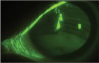 Dr. Fleiszig's work over the years has opened up new doors and challenged traditional thinking in contact lens-induced microbial keratitis. In a normal, healthy ocular surface, bacterial inoculation does not usually result in infection. In fact, her laboratory has reported that normal, healthy eyes clear viable bacteria within a few hours, likely from the involvement of preformed innate immune defense mechanisms (Mun et al, 2009). It is widely believed that infection is prevented because bacteria cannot adhere to the cornea or penetrate to the stroma unless the epithelial barrier is grossly damaged, as it is in the deep corneal abrasion shown in Figure 1.