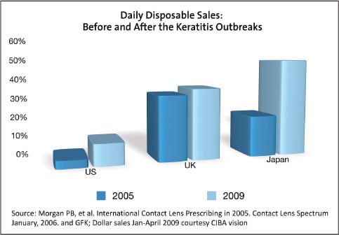 Discarding lenses, especially potentially contaminated ones, after one use does appear to provide the greatest hope for reducing—but not eliminating—risk. But when we look at the sales of daily disposables, especially within the United States, we do not see that large increase in utilization that you might expect. In Japan, sales have jumped to 50 percent (Figure 1). The Scandinavian marketplace has also been extremely receptive, with daily disposables exceeding 50 percent since the outbreaks.