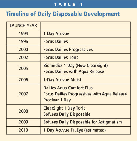 There were other barriers to the modality initially, including parameter availability. 1-Day Acuvue (Vistakon) was the only product available. Thus, there was only one material with only single vision spherical correction for almost three years. In 1997, Ciba Vision entered the daily disposable race with Focus Dailies. Ciba's product brought competition to the market and encouraged the development and progression of this modality. In the last several years, there has been rapid growth in availability and options within the modality (Table 1).