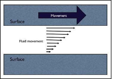 Friction and Lubrication Where one surface moves against another with a liquid in between, there will be a gradient of movement in the interstitial liquid. The liquid layer immediately adjacent to the moving surface is dragged by it and then exerts a lesser drag on the next layer, creating a gradient of movement in the liquid (Figure 3). The amount of drag exerted between each surface and the liquid depends on the viscosity of the liquid and the distance between the surfaces. In the eye, this is more complex because of the presence of non-uniform tear components and the extent to which the epithelial surface keys to the mucin glycocalyx (Cher, 2008).
