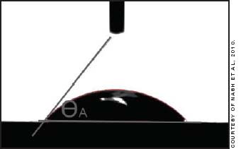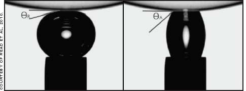 Wettability is quantified by measuring the contact angle (the angle at an interface bounded by the contact lens), the liquid (usually, but not always, purified water), and air. The contact angle is an indication of the level of attraction, or energy, between the materials on either side of the interface. A small angle means that the attraction is high, and the liquid will spread easily as a film with relatively little energy, while a large angle corresponds to a high energy state with little attraction, causing the liquid to stand away from the surface. There are three values of wetting angle: advancing, in which the interface is moving across the surface from wet to dry; receding, in which it is going in the opposite direction; and hysteresis, which is the difference between them. The amount of hysteresis is an indication of the mobility of the hydrophilic and hydrophobic groupings and the ability of the surface to change between hydrophilic or hydrophobic states (Tighe, 2004).
