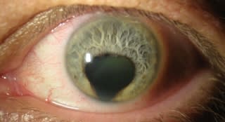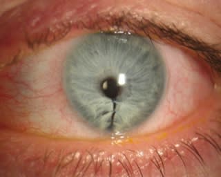 The first photo shows a patient who has an iris coloboma, which presents as a keyhole notch in the inferior quadrant of the iris. An iris coloboma is a congenital defect secondary to failure of the optic fissure to close during embryonic development. Other types of colobomas can include notched defects of the ciliary body, retina, and choroid. Patients who have a coloboma may also have other malformations including a cleft palate/lip.