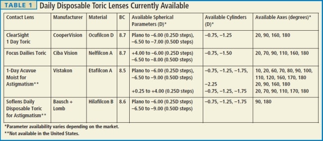 Every large manufacturer has released a DD toric lens. Table 1 outlines parameters and properties of all current DD torics now available and those not yet available in the United States.