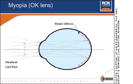 As the peripheral retina seems to be responsible, at least in part, for eye development in children, orthokeratology experts wondered, "Is this the mechanism responsible for the myopia progression reduction in corneal reshaping?" Several clinicians and researchers have reported that the midperipheral corneal steepening in myopic orthokeratology may lead to peripheral myopic blur, which may act as a signal to slow eye growth. Indeed, orthokeratology has been found to create central emmetropia with peripheral myopia (Charman et al, 2006; Queiros et al, 2010).