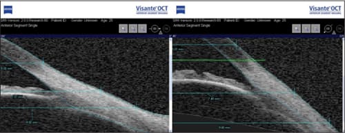 Figure 3. Flat (left) versus steep anterior scleral shape as shown with the Visante (Carl Zeiss Meditec) anterior segment OCT (Pacific University).