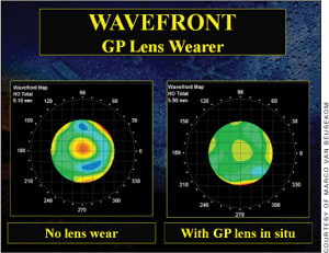 Figure 4. Wavefront aberration maps with and without a GP lens in situ showing the total higher-order aberrations, taken with the iTrace (Tracey).
