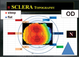 Figure 2. Mapping the entire anterior segment surface of the eye: Example of anterior scleral angles in the right eye of a subject in relation to corneal topography of the same eye (Pacific University).