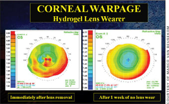 Improving Corneal Physiology Corneal warpage is not uncommon in daily contact lens practice, although its magnitude can differ dramatically. It is wrong to assume that it occurs only with GP lenses: it is estimated that at least one-third of corneal warpage cases come from soft lens wear (Figure 1), so take caution when evaluating soft lens wearers who are candidates for refractive surgery.