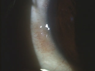 Biomicroscopic examination revealed an elevated vascularized lesion straddling the right nasal limbus. The left nasal limbus had a much less developed and smaller lesion (second figure). The right eye mass was mobile, did not seem to be adherent to underlying sclera, and appeared to be non-pigmented. Fundus examination was entirely unremarkable. Our differential list included carcinoma in situ, amelanotic melanoma, scarring secondary to trauma, and an atypical pterygium. The very early age of onset was of great concern to us.