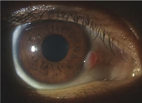 This 15-year-old male patient presented with a history of a "red spot" that appeared on the limbus of his right eye 18 months earlier. He noted that it became more injected at times. It had remained fairly consistent in size until several months ago when it began to grow. The patient could not remember any specific trauma to the right eye. His uncorrected presenting acuities were 20/20 OU.