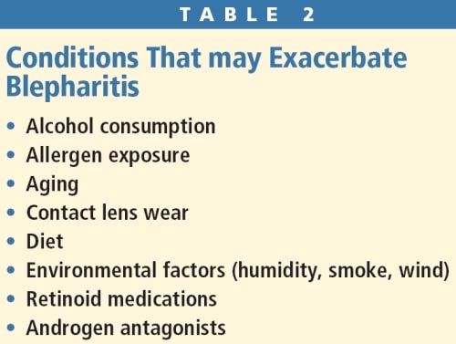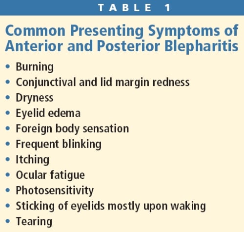 Blepharitis often occurs in conjunction with other ocular surface conditions such as dry eye and conjunctivitis because of their contributions to the pathogenesis of the disease (Hara, 1996; Papier, 2007; Raskin, 1992). Table 1 lists typical presenting ocular symptoms that accompany both anterior and posterior blepharitis. Table 2 lists intrinsic and extrinsic factors that can exacerbate the progression of blepharitis.