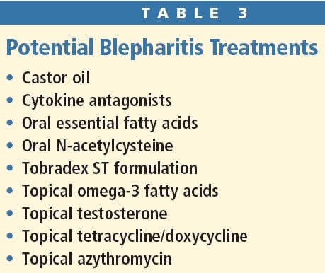 Several blepharitis treatment strategies are available. Unfortunately, multiple treatments are necessary as individual regimens only treat either the infectious or the inflammatory component of the disease. In addition, many of these treatments are slow in improving symptoms, messy, interfere with vision, require long-term use, and can lead to secondary complications such as increased intraocular pressure or bacterial or viral infections. New treatments, including topical azithromycin and a new formulation of Tobradex, may provide a major benefit as these medications address both the infectious and the inflammatory components. Future novel treatments, including topical testosterone and omega fatty acids, may prove very beneficial in the treatment of this ubiquitous eye condition. CLS