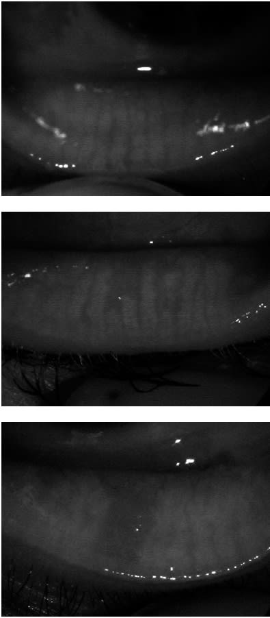 Figure 4. Meibography photos of (top) normal and (middle and bottom) abnormal meibomian gland appearance. Note the atrophy affecting the distal portion of the two center glands in the middle photo and the missing meibomian glands just to the left of center in the bottom photo.